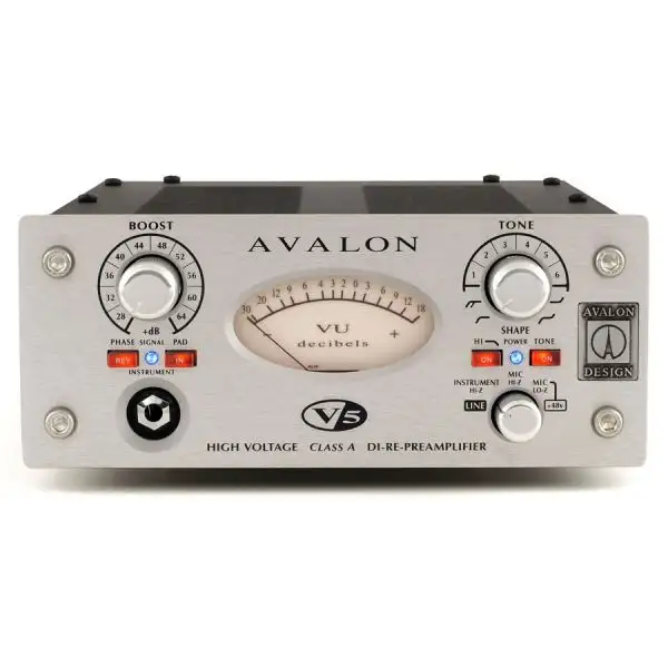 The Avalon V5 DI-RE-MIC Preamplifer is an ultra-high-performance professional preamplifier, DI and RE-amper. Created for maximum versatility, the V5’s sonic signature – “Deep and Controlled Bass, Musical Mid-range and enhanced Vocal Projection” combine with a unique set of user features including, 100% discrete Pure Class A amplification, Avalon’s unique “passive” TONE-BANK, professional VU meter with dual peak LEDs, multiple outputs including an instrument level transformer isolated Re-amp. Designed to optimize absolute signal integrity and musical performance, the V5 is ideal for ribbon, dynamic and condenser microphones, bass guitar, acoustic instruments, electric guitars, keyboards, synthesizers, and very low output passive pickups